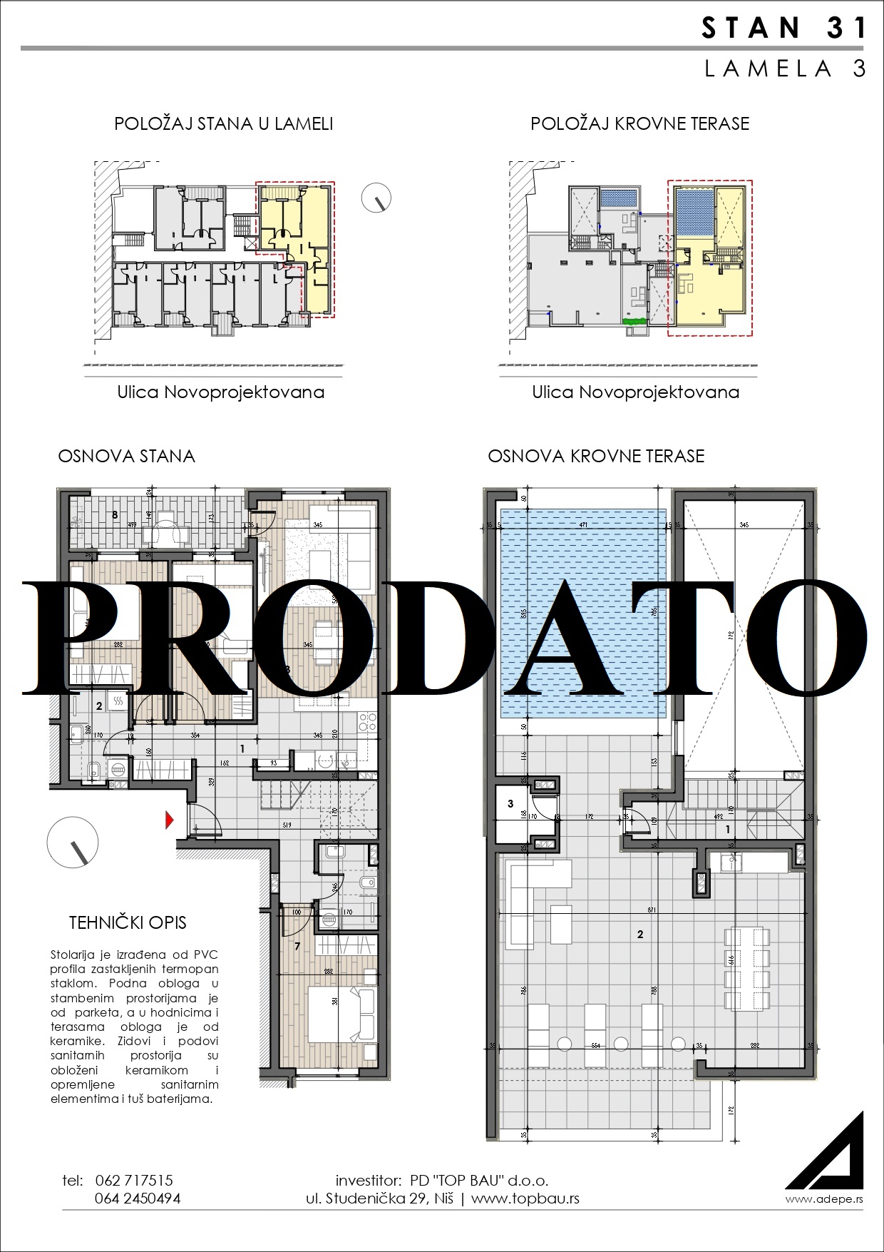 Stanovi su na šestom spratu, projektovani sa duplom spratnom visinom dnevnog dela iz koga internim stepeništem imaju izlaz na pripadajuće krovne terase. Na krovnim terasama nalazi se bazen, zelenilo i prateći sadržaj.